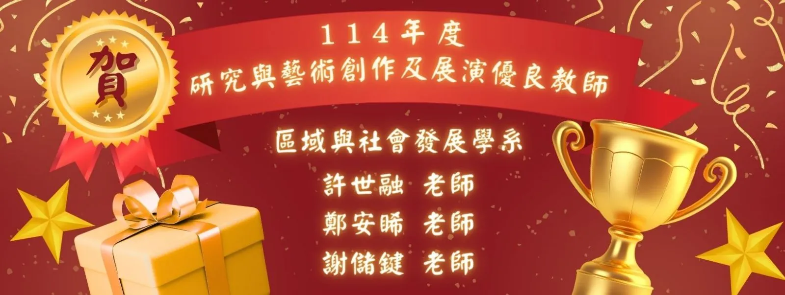 [榮譽]恭賀!本系 許世融老師.鄭安睎老師.謝儲鍵老師 榮獲本校114年度研究與藝術創作及展演優良教師