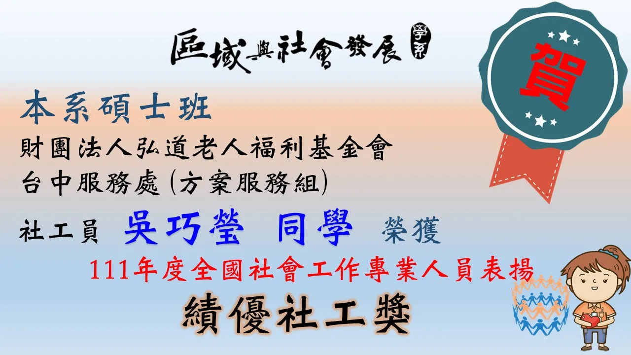 111年度研究生吳巧瑩同學-榮獲全國社工人員績優社工獎